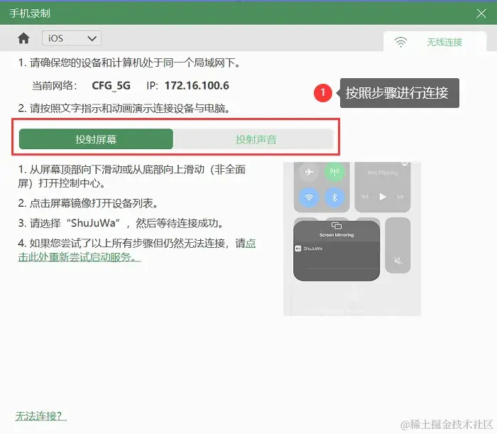 第2步:在手机录制模式中,类型选择iOS录制,然后通过无线连接方式,将苹果手机投屏到需要录制的电脑上。