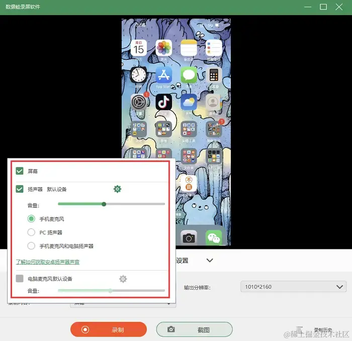 第3步:投屏成功后,我们可以对录制参数进行设置,包括录制分辨率、输出分辨率和音频来源等,然后就可以开始录制了。