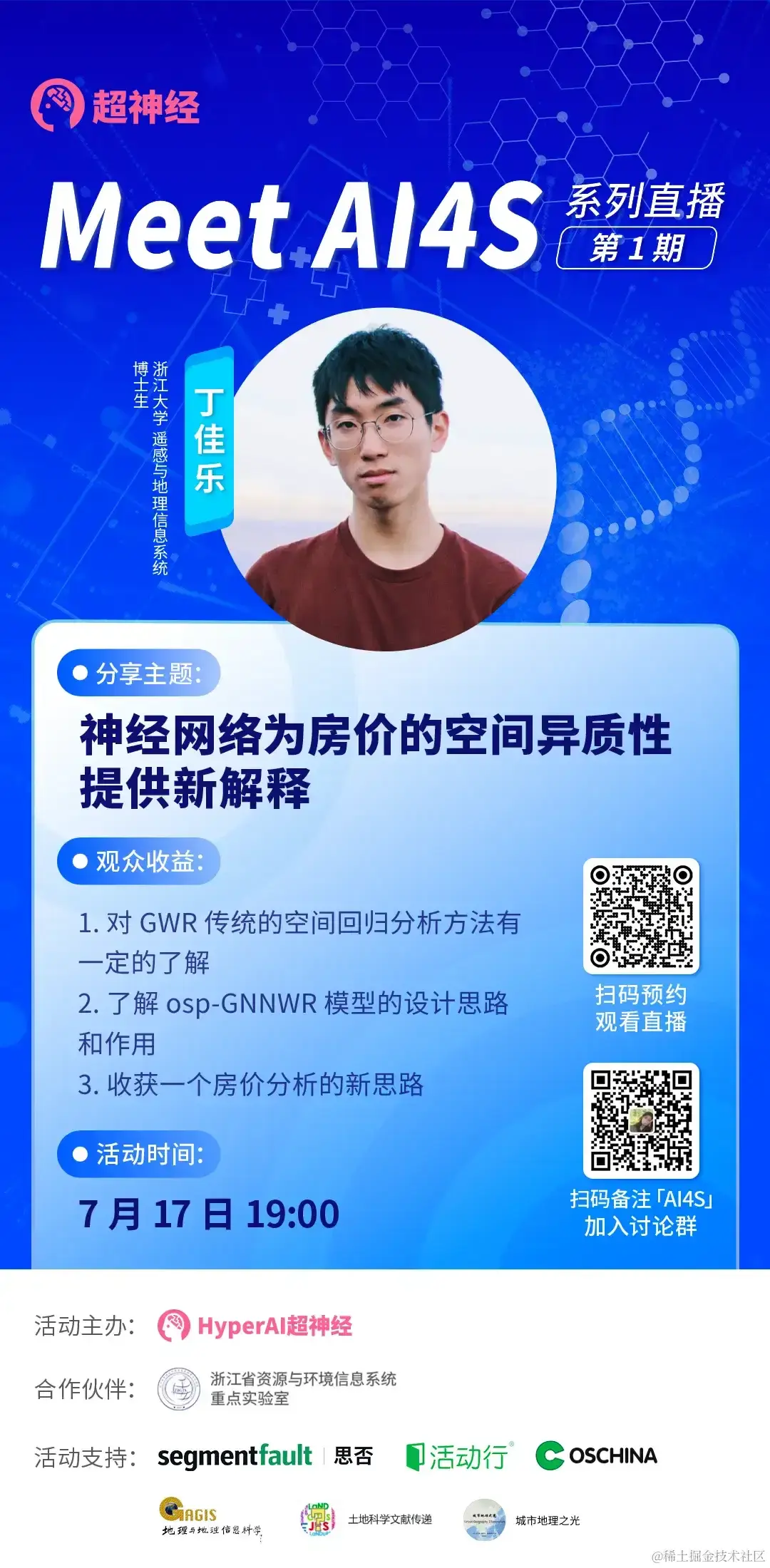「Meet AI4S」系列直播第一期将于 7 月 17 日 19:00 正式上线,我们有幸邀请到了浙江大学遥感与地理信息系统博士生丁佳乐,他将以「神经网络为房价的空间异质性提供新解释」为题, 深入浅出地为大家介绍模型的设计思路与应用场景,并进一步分享地理加权回归的空间回归分析方法。