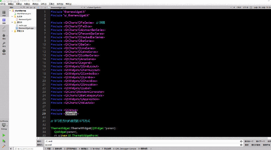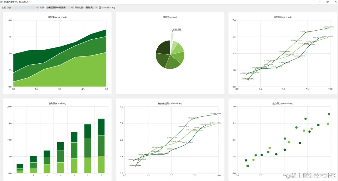 #include "themewidget.h"#include "ui_themewidget.h"#include <QtCharts/QPieSeries> // 饼图#include <QtCharts/QPieSlice>#include <QtCharts/QAbstractBarSeries>#include <QtCharts/QPercentBarSeries>#include <QtCharts/QStackedBarSeries>#include <QtCharts/QBarSeries>#include <QtCharts/QBarSet>#include <QtCharts/QLineSeries>#include <QtCharts/QSplineSeries>#include <QtCharts/QScatterSeries>#include <QtCharts/QAreaSeries>#include <QtCharts/QLegend>#include <QtWidgets/QGridLayout>#include <QtWidgets/QFormLayout>#include <QtWidgets/QComboBox>#include <QtWidgets/QSpinBox>#include <QtWidgets/QCheckBox>#include <QtWidgets/QGroupBox>#include <QtWidgets/QLabel>#include <QtCore/QRandomGenerator>#include <QtCharts/QBarCategoryAxis>#include <QtWidgets/QApplication>#include <QtCharts/QValueAxis>#include <QDebug>#include <QToolTip>// 学习官方代码规范的书写方式ThemeWidget::ThemeWidget(QWidget *parent) : QWidget(parent), m_ui(new Ui_ThemeWidgetForm){ m_ui->setupUi(this); m_listCount = 3; m_valueMax = 10; m_valueCount = 7; // 生成随机数据 m_dataTable.append(generateRandomData(m_listCount, m_valueMax, m_valueCount)); // 填充主题框 populateThemeBox(); // 填充动画框 populateAnimationBox(); // 填充图例框 populateLegendBox(); // 创建图表 QChartView *chartView; // 创建面积图 chartView = new QChartView(createAreaChart()); m_ui->gridLayout->addWidget(chartView, 1, 0); m_charts << chartView; // 创建饼图 chartView = new QChartView(createPieChart()); // 如果饼片标签不适合屏幕,就会发生有趣的事情,所以我们忽略了大小策略 chartView->setSizePolicy(QSizePolicy::Ignored, QSizePolicy::Ignored); m_ui->gridLayout->addWidget(chartView, 1, 1); m_charts << chartView; // 创建折线图 chartView = new QChartView(createLineChart()); m_ui->gridLayout->addWidget(chartView, 1, 2); m_charts << chartView; // 创建条线图 chartView = new QChartView(createBarChart(m_valueCount)); m_ui->gridLayout->addWidget(chartView, 2, 0); m_charts << chartView; // 创建样条曲线图 chartView = new QChartView(createSplineChart()); m_ui->gridLayout->addWidget(chartView, 2, 1); m_charts << chartView; // 创建散点图 chartView = new QChartView(createScatterChart()); m_ui->gridLayout->addWidget(chartView, 2, 2); m_charts << chartView; // 设置默认值 m_ui->antialiasCheckBox->setChecked(true); // 将明亮主题中的颜色设置为默认颜色 QPalette pal = qApp->palette(); // 一般背景颜色 pal.setColor(QPalette::Window, QRgb(0xf0f0f0)); // 使用窗口文本来代替 pal.setColor(QPalette::WindowText, QRgb(0x404044)); qApp->setPalette(pal); // 更新图表 updateUI();}ThemeWidget::~ThemeWidget(){ delete m_ui;}// 生成随机数据[0]DataTable ThemeWidget::generateRandomData(int listCount, int valueMax, int valueCount) const{ // listCount = 3 valueMax = 10 valueCount = 7 qDebug () << "[generateRandomData]->[start]->listCount = " << listCount << "valueMax = " << valueMax << "valueCount = " << valueCount; DataTable dataTable; // 生成随机数据 for (int i(0); i < listCount; i++) { // 3组 DataList dataList; qreal yValue(0); qreal xValue(0); for (int j(0); j < valueCount; j++) { // 每组7个数据 // 随机数范围 = 10 / 7 ≈ 1.428571... = [0, 1.428571...) qreal yRandomNum = QRandomGenerator::global()->bounded(valueMax / (qreal) valueCount); // 范围是 [0, 7) yValue的后一个值一定大于等于前一个值(纵坐标⬆) yValue = yValue + yRandomNum; // 随机数范围 = [0, 1) qreal xRandomNum = QRandomGenerator::global()->generateDouble(); // 范围在 [0, 10) xValue的后一个值一定大于等于前一个值(横坐标->) xValue = (j + xRandomNum) * ((qreal) m_valueMax / (qreal) valueCount); qDebug() << "j = " << j << "[yValue = " << yValue << "] yRandomNum = " << yRandomNum<< " [xValue = " << xValue << "] xRandomNum = " << xRandomNum; // 坐标(x,y) QPointF value(xValue,yValue); QString label = "Slice " + QString::number(i) + ":" + QString::number(j); dataList << Data(value, label); // 传入((x,y),切片) } qDebug() << "dataList-size = " << dataList.size() << Qt::endl; dataTable << dataList; } //qDebug () << " dataTable = " << dataTable << " size = " << dataTable.size(); qDebug () << "[generateRandomData]->[end]->listCount = " << listCount << "valueMax = " << valueMax << "valueCount = " << valueCount << Qt::endl; return dataTable;}// 填充主题框[1]void ThemeWidget::populateThemeBox(){ // 向主题组合框中添加项目 m_ui->themeComboBox->addItem("明亮色", QChart::ChartThemeLight); m_ui->themeComboBox->addItem("天蓝色", QChart::ChartThemeBlueCerulean); m_ui->themeComboBox->addItem("黑暗色", QChart::ChartThemeDark); m_ui->themeComboBox->addItem("沙棕色", QChart::ChartThemeBrownSand); m_ui->themeComboBox->addItem("自然色彩系统(ncs)的蓝色", QChart::ChartThemeBlueNcs); m_ui->themeComboBox->addItem("高对比度", QChart::ChartThemeHighContrast); m_ui->themeComboBox->addItem("冰冷的蓝色", QChart::ChartThemeBlueIcy); m_ui->themeComboBox->addItem("Qt", QChart::ChartThemeQt);}// 填充动画框[2]void ThemeWidget::populateAnimationBox(){ // 将项目添加到动画组合框中 m_ui->animatedComboBox->addItem("动画在图表中被禁用", QChart::NoAnimation); m_ui->animatedComboBox->addItem("图表中启用网格轴动画", QChart::GridAxisAnimations); m_ui->animatedComboBox->addItem("图表中启用系列动画", QChart::SeriesAnimations); m_ui->animatedComboBox->addItem("图表中启用所有动画类型", QChart::AllAnimations);}// 填充图例框[3]void ThemeWidget::populateLegendBox(){ // 向图例组合框中添加项目 m_ui->legendComboBox->addItem("图例 无", 0); m_ui->legendComboBox->addItem("图例顶部", Qt::AlignTop); m_ui->legendComboBox->addItem("图例底部", Qt::AlignBottom); m_ui->legendComboBox->addItem("图例左部", Qt::AlignLeft); m_ui->legendComboBox->addItem("图例右部", Qt::AlignRight);}// 面积图[4]QChart *ThemeWidget::createAreaChart() const{ qDebug () << "[createAreaChart]->[start]->m_da