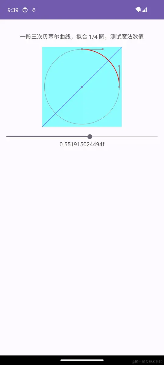 - 通过一段三次贝塞尔曲线,拟合 1/4 圆