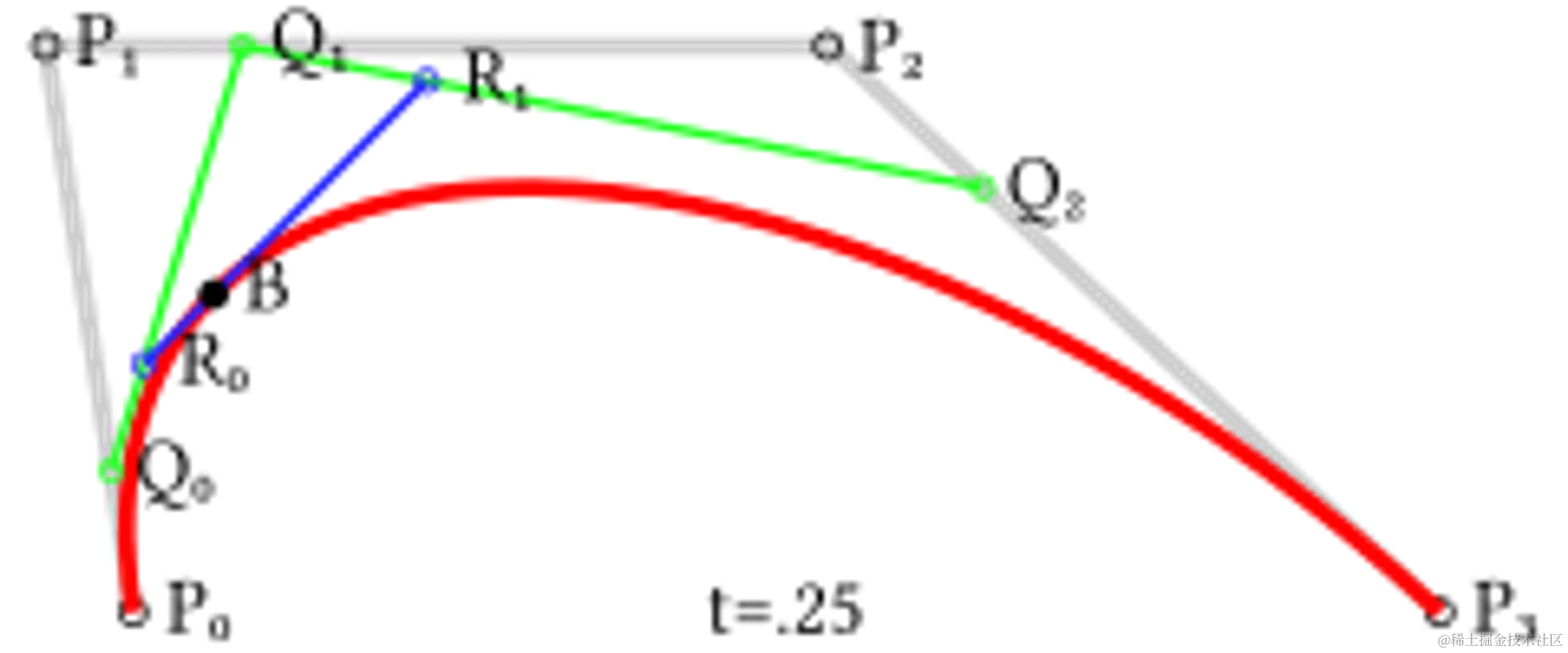 对于三次曲线,可由线性贝塞尔曲线描述的中介点 Q0、Q1、Q2,和由二次曲线描述的点 R0、R1所建构:
