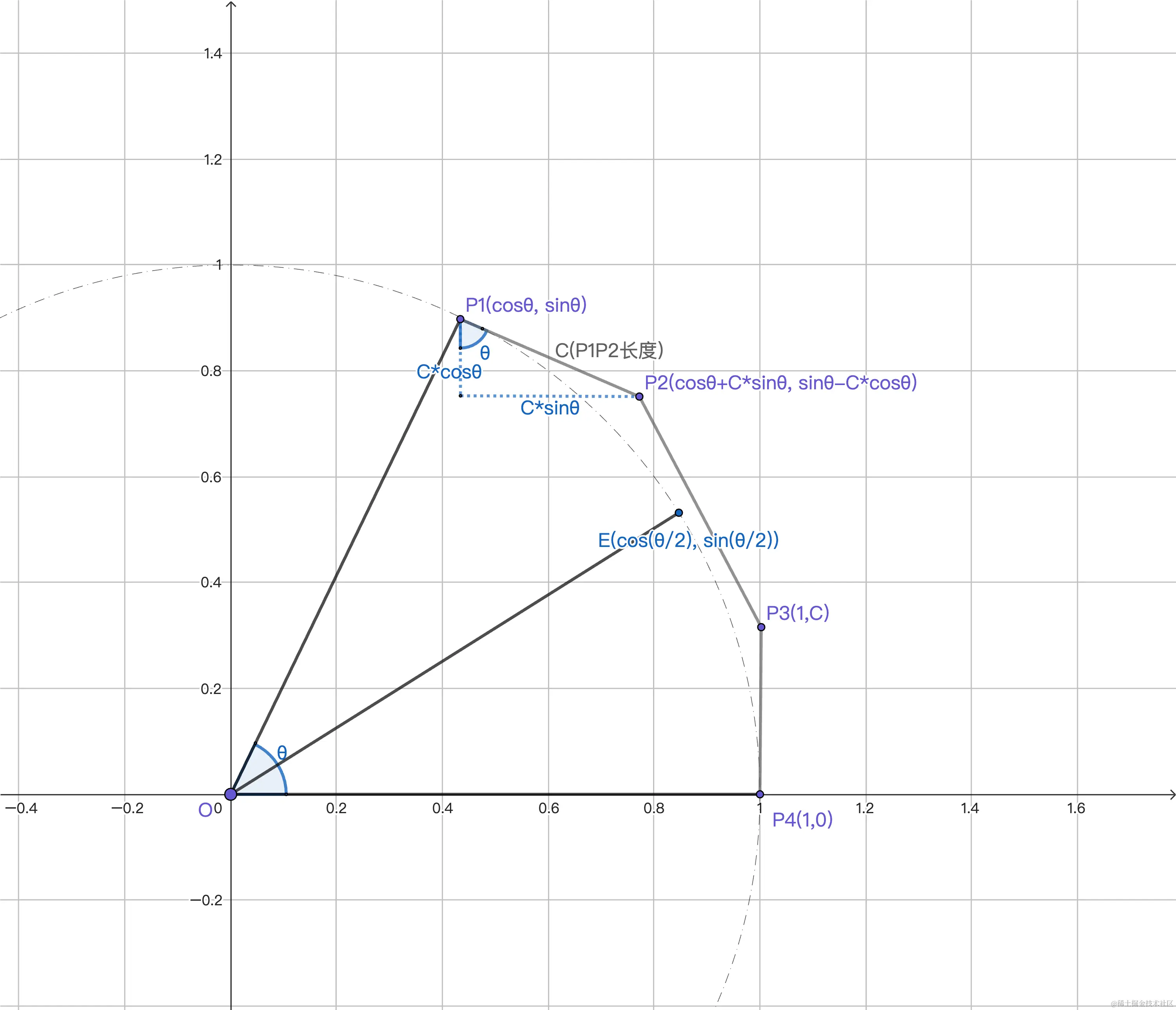 P1,P4 为锚点,P2,P3 为控制点。通过圆心 O 作一段圆弧 P1P4,P1P2,P4P3 为切线并且 P1P2=P4P3=C,E 点为圆弧 P1P4 的中点,这样,以 P1、P2、P3 和 P4 作为三次贝塞尔曲线的控制点,求得使曲线的中点经过 E 时,对应的 C 值。