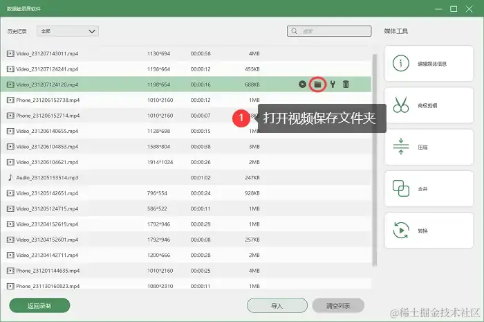 步骤4:如果你想知道视频被保存在哪里,可以来到录制历史页面,这里能找到之前录制过的视频,点击即可打开视频文件夹。