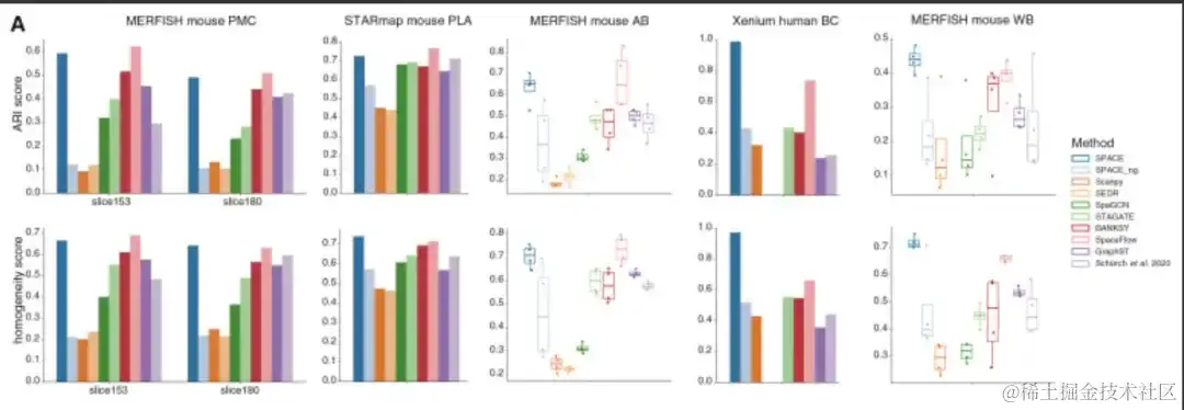 空间转录组学研究的一项重要任务是发现给定组织中的组织模块。为了评估 SPACE 在这方面的能力,研究人员将 SPACE 与 SEDR、SpaGCN、STAGATE、BANKSY、SpaceFlow、GraphST 、Schürch 等人的方法,以及 SCANPY 和 SPACE_ng 进行了比较,并使用了两个前述的 ST 数据集 (MERFISH 小鼠 PMC 数据集和 STARmap 小鼠 PLA 数据集),以及三个具有标注组织模块的附加数据集,包括 MERFISH 小鼠老化大脑 (AB) 数据集、MERFISH 小鼠整个大脑(WB) 数据集和 Xenium 人类乳腺癌 (BC) 数据集,这些数据集代表了从不同组织、不同条件下获得的 ST 数据。