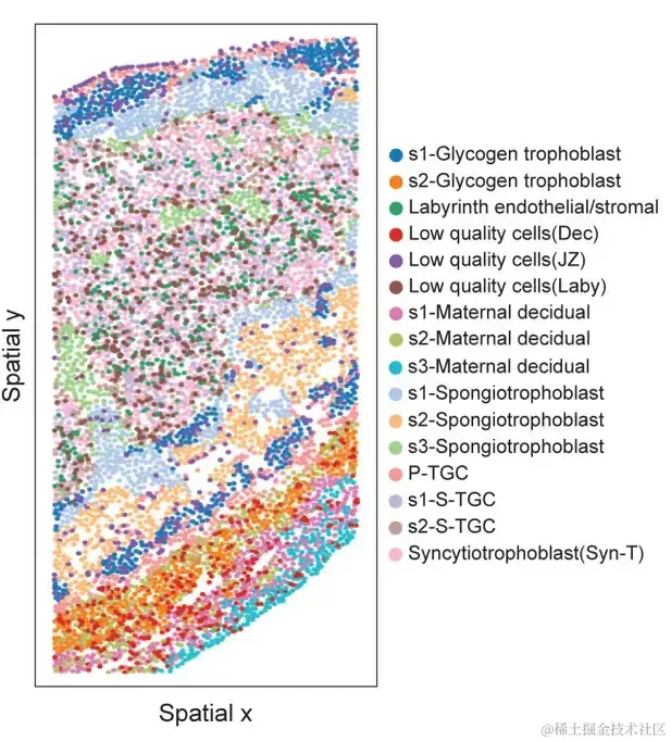 STARmap 小鼠胎盘 (PLA) 数据集中具有空间位置和由SPACE 识别的空间信息相关细胞类型的细胞