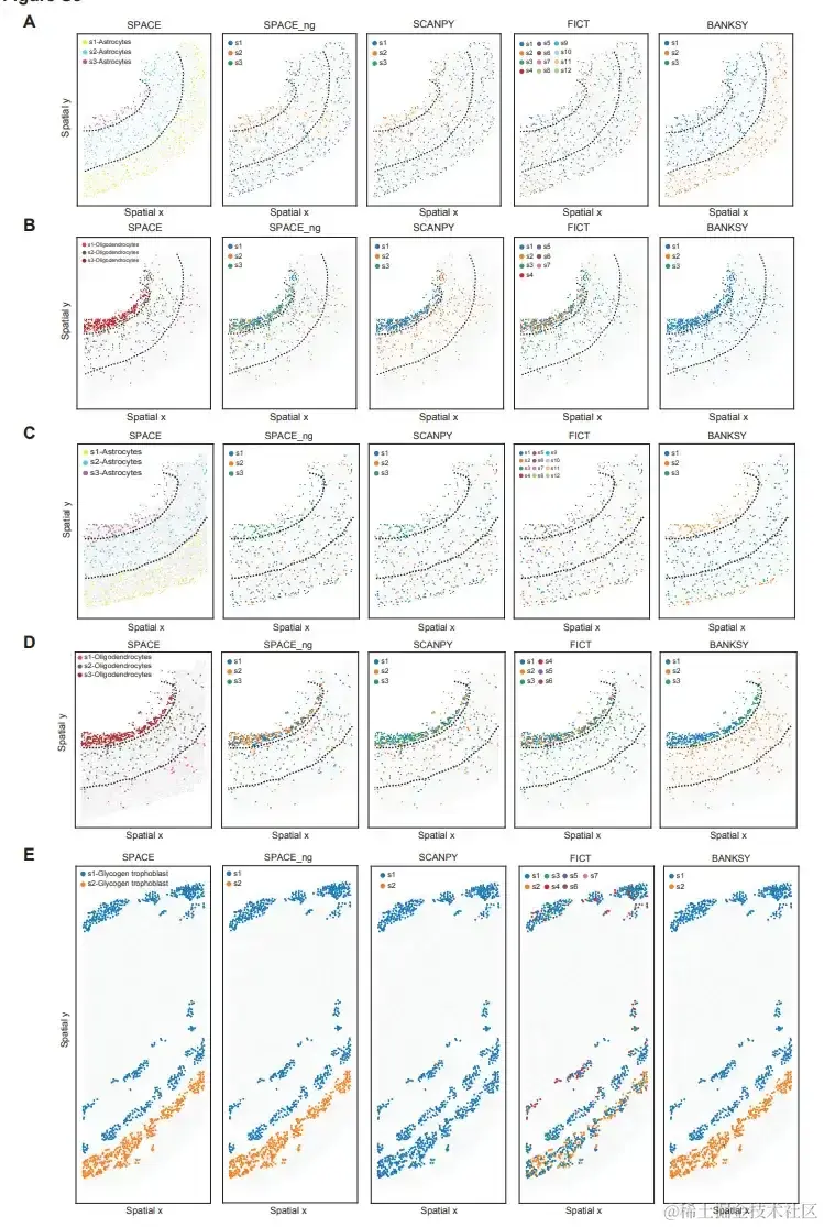 对于 STARmap 小鼠 PLA 数据集,虽然 SPACE 和 BANKSY 成功识别了两种糖原滋养层细胞亚型,但 SCANPY 和 FICT 未能识别糖原滋养层细胞亚型,这可能是由于两种糖原滋养层细胞亚型之间的周围细胞类型存在明显差异。