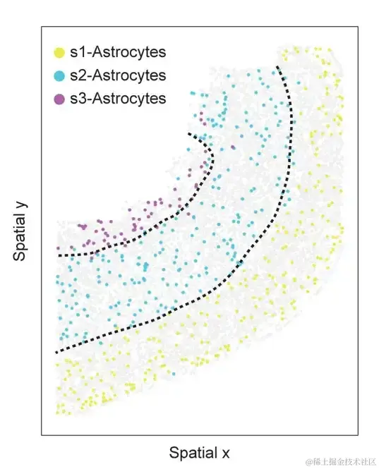 MERFISH 小鼠 PMC 数据集中第 153 片的空间信息相关的星形胶质细胞亚型。细胞按星形胶质细胞亚型进行着色,浅灰色点表示其他细胞。虚线表示上层、深层和白质