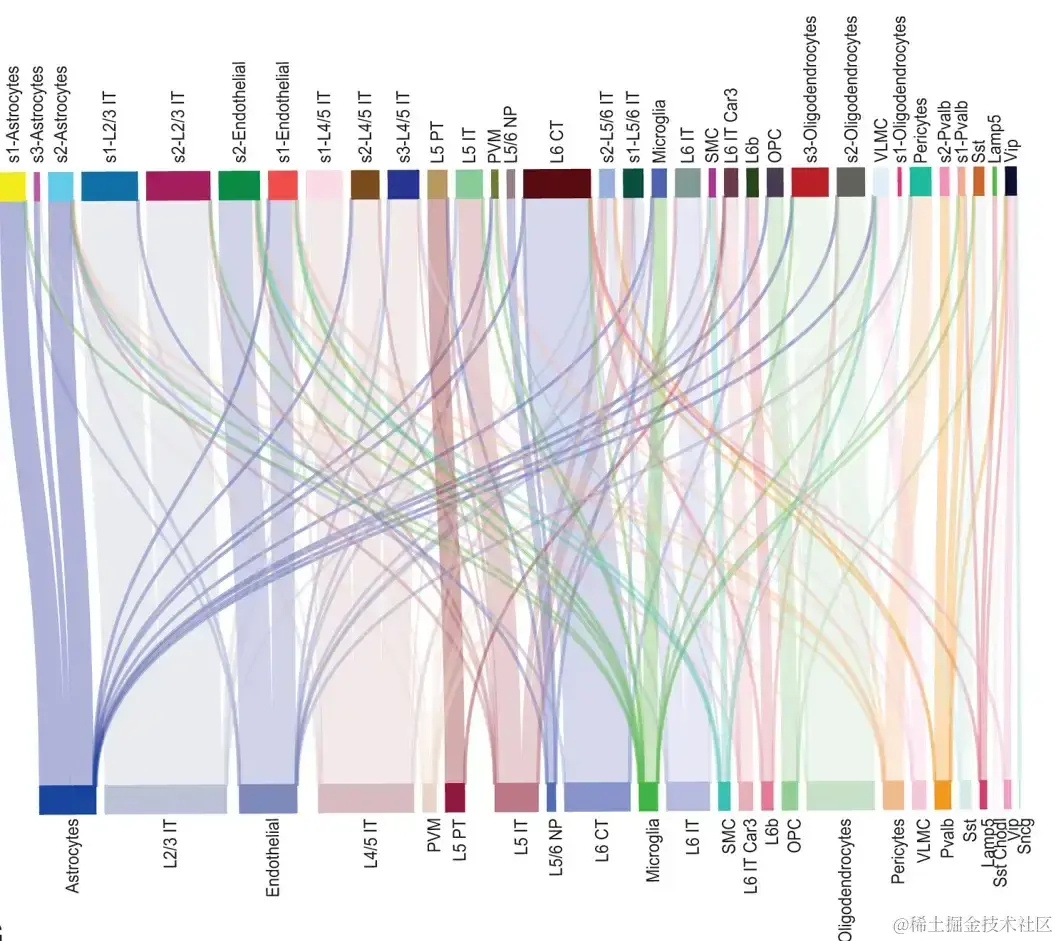 桑基图展示了 MERFISH 小鼠 PMC 数据集的第 153 片中,所有细胞的空间信息中,相关细胞类型与原始细胞类型之间的对应关系