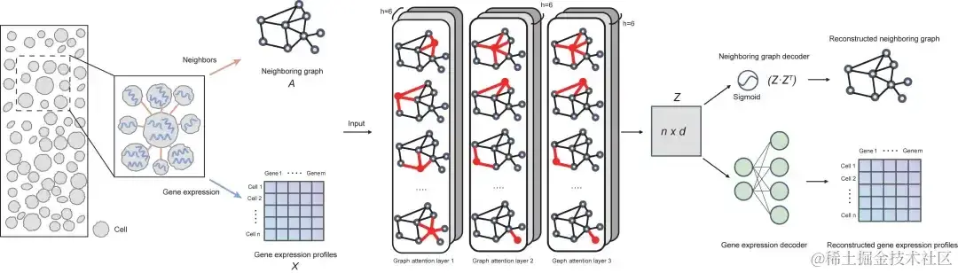 从架构来看,SPACE 模型由三部分组成:编码器 (三层图注意网络)、邻近图解码器和基因表达解码器, 下图显示了该模型的整体框架: