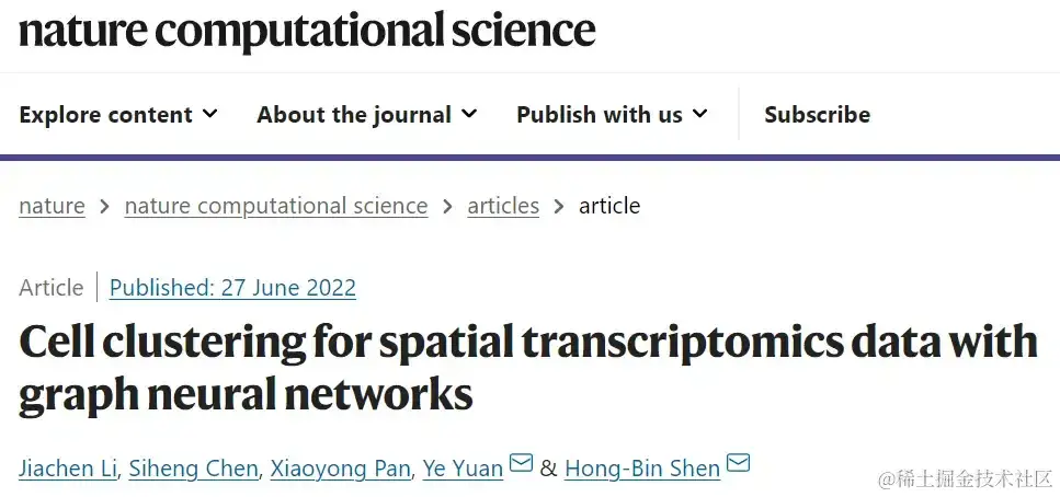 2022 年 7 月,上海交通大学电子信息与电气工程学院自动化系沈红斌教授、 袁野副教授课题组在 Nature 子刊 Nature Computational Science 上发表了题为:「Cell clustering for spatial transcriptomics data with graph neural networks 」(利用图神经网络对空间转录组数据进行细胞聚类) 的研究论文。