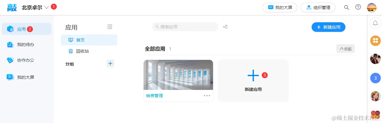 进入你的组织,点击左侧的应用,然后点击新建应用