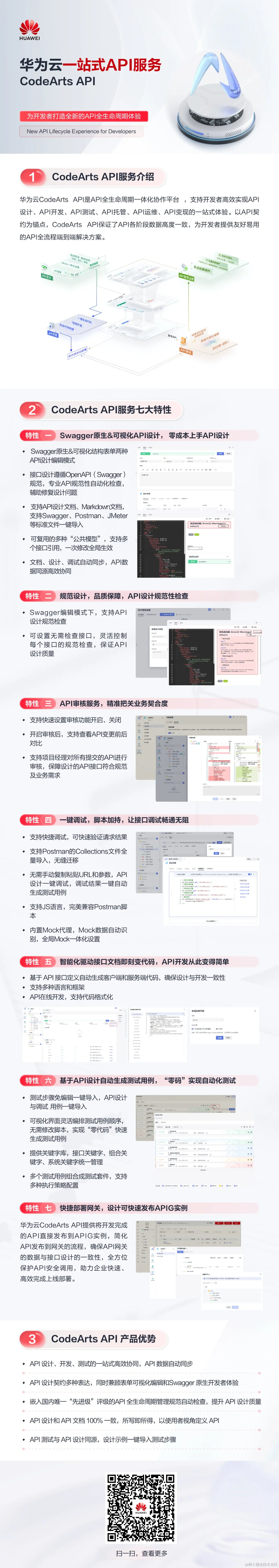 华为云CodeArts API是API全生命周期一体化协作平台,支持开发者高效实现API设计、API开发、API测试、API托管、API运维、API变现的一站式体验。
