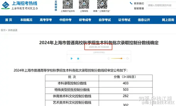 看看上海的分数线,公布的比较早是2024年06月23日13时42分公布的,这是上海市教育考试院官方网截图。