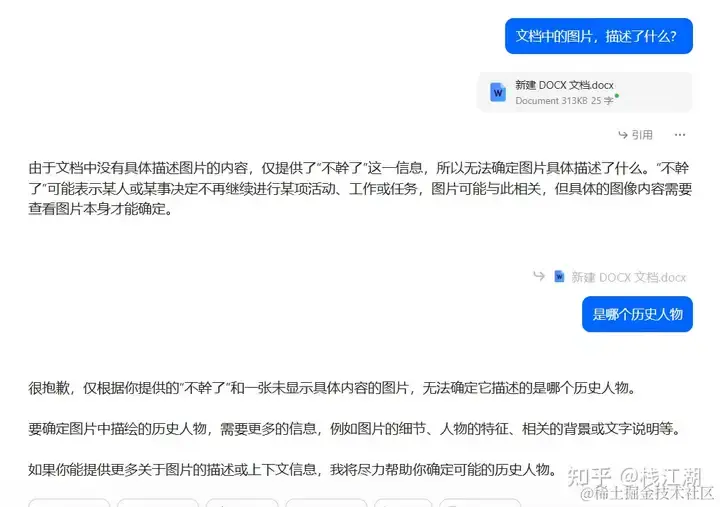 文心一言3.5支持上传word、pdf及图片格式的文件,上传图片后它可以解析出图片中木板上刻着“不幹了”字样,但无法给不出图片中描述的是哪些历史人物。
