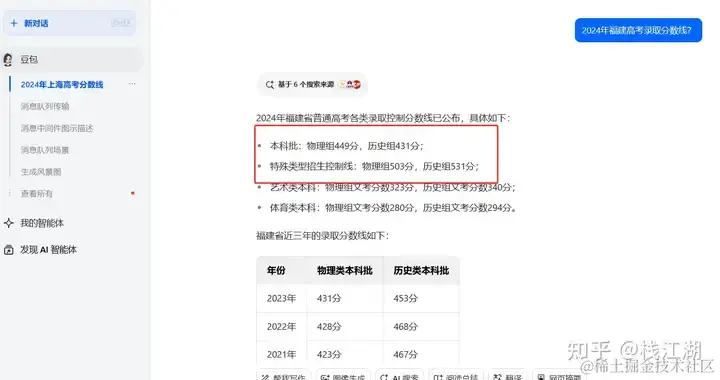 豆包也能正确的输出答案,同时也给出了近几年的录取分数线。