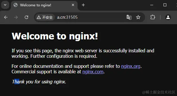在完成上述配置之后,便实现了用户自建的网关运行时 Ingress Gateway – Gateway – Virtual Service 等资源的联动,用户能够根据 Gateway 的定义利用域名:端口访问 Kubernetes 集群中的资源。下图为一个简单样例,展示了在按照上述流程设置成功后,访问集群中某命名空间中的 nginx 的测试页面。其中,在 Gateway 和 VirtualService 中配置了 a.cn 的路由规则,并在 host 文件中对 a.cn 配置了对应的 IP 地址,端口号为用户自建的网关运行时的 Service 中的 http2 对应的 Nodeport 端口。