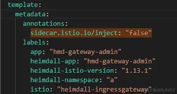 为了防止 Istio 将用户命名空间中部署的 Ingress Gateway 作为普通应用纳入服务网格中管理,需要在其 Deployment 的 spec.template.annotations 字段中保证sidecar.istio.io/inject: "false" 字段的存在。