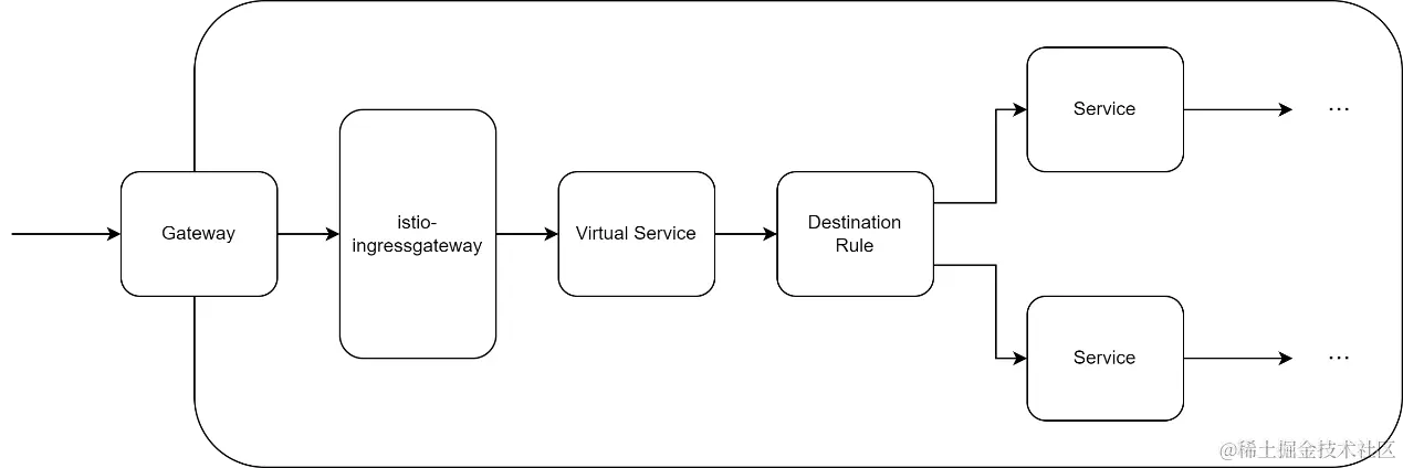 在 Kubernetes 集群环境中,默认配置下的 Istio 将会部署至 istio-system 命名空间下,通过向 pod 中自动注入代理容器,Istio 将 pod 纳入服务网格的管理之中,实现对服务间通信的统一管理和控制。在 istio-system 命名空间中,网关运行时负责处理所有流入服务网格的外部流量。网关运行时将根据 CRD 资源 Gateway 中的定义监听特定的域名与端口,并根据 Virtual Service 与 Destination Rule 将请求智能地路由到后端的 Kubernetes Service,并最终访问到对应的微服务。
