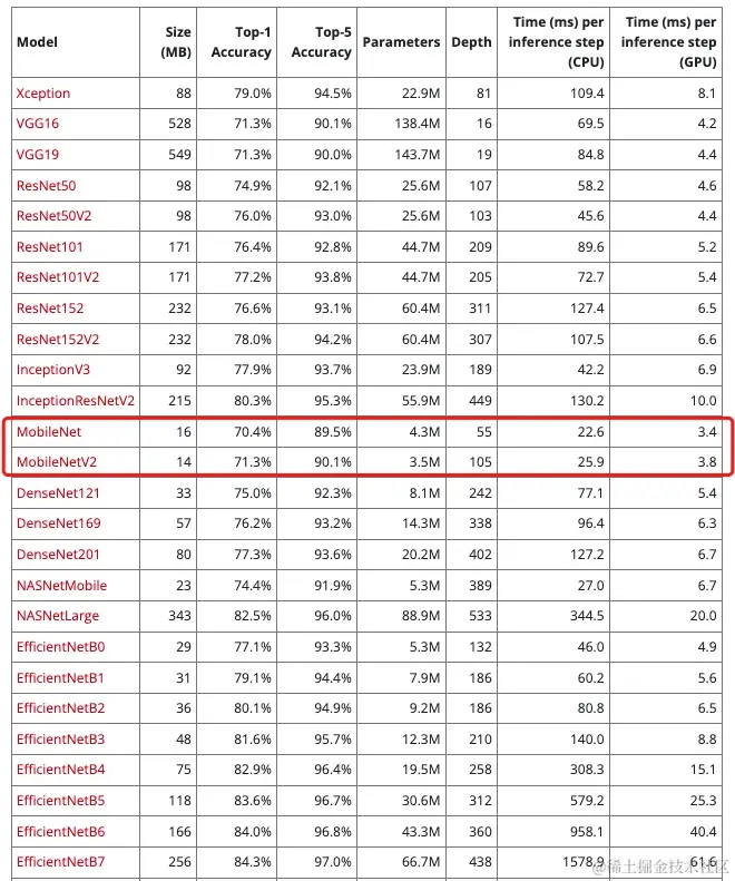 我们根据上图中的模型对比可以看到 mobilenet 这种模型更符合我们的需求(模型的名字就能看出来)。