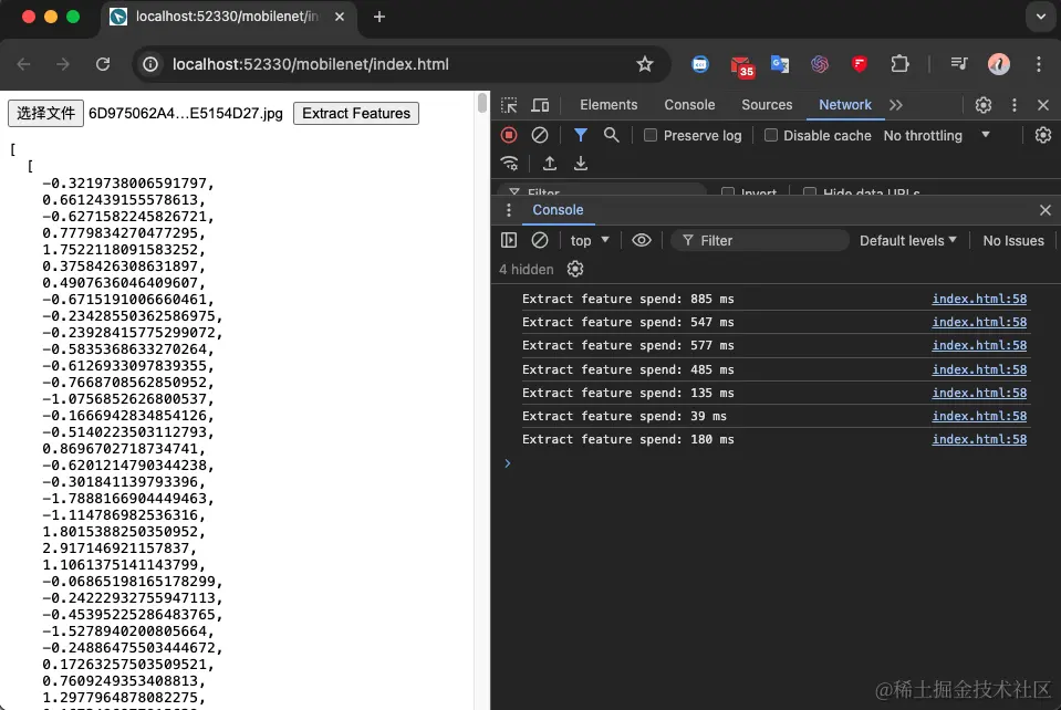 以下给出一个前端使用 mobilenet 完成图像特征提取的示例: