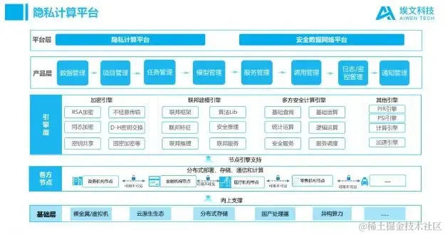 在隐私计算方向,通过加密算法、安全协议和分布式计算等技术,实现在原始数据不被泄露前提下跨机构之间的数据价值共享流通,达到“数据可用不见,数据不动价值动”的目的,帮助客户在安全合规的前提下,扩充数据样本及维度,增强业务风控、精准营销、统计分析等业务能力。
