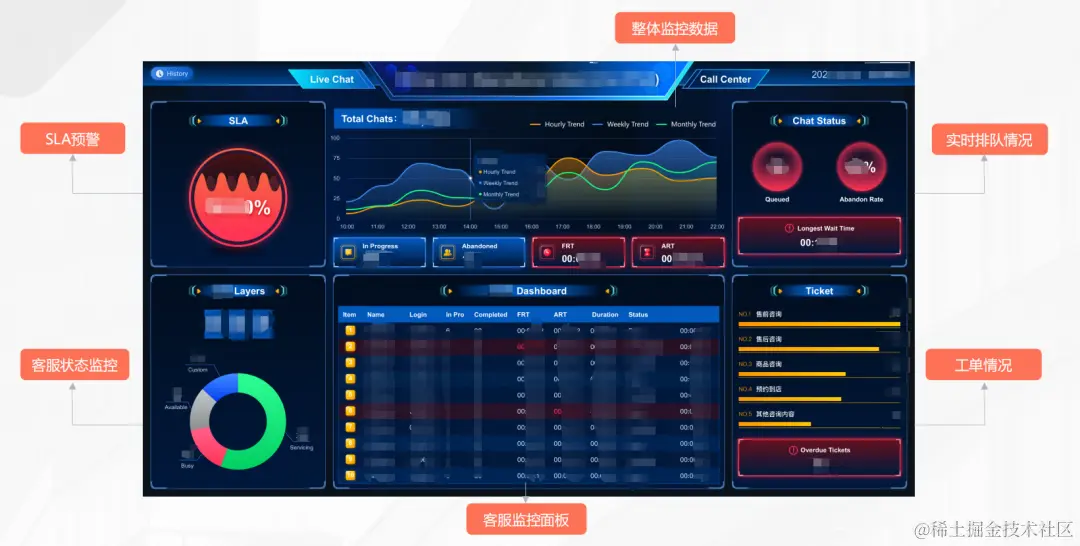 客服组长与部门Leader可以通过定制化的服务大屏观看SLA、客户排队情况、服务单、客服服务状态等情况,并以此为依据持续提升服务中心水平。