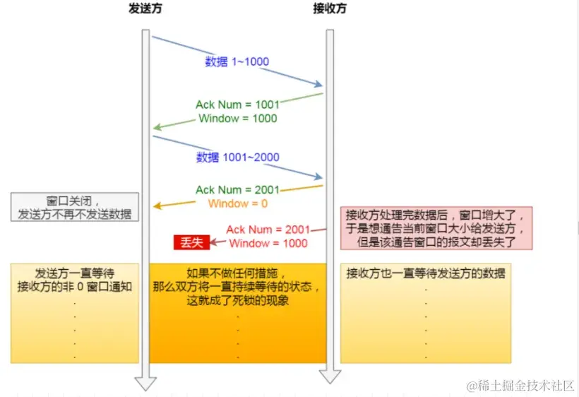 当发送窗口关闭时,在接受方处理完数据后,接受方会向发送方通告一个窗口非 0 的 ACK 报文,如果这个通告窗口的 ACK 报文在网络中丢失了,那就会造成很严重的后果。