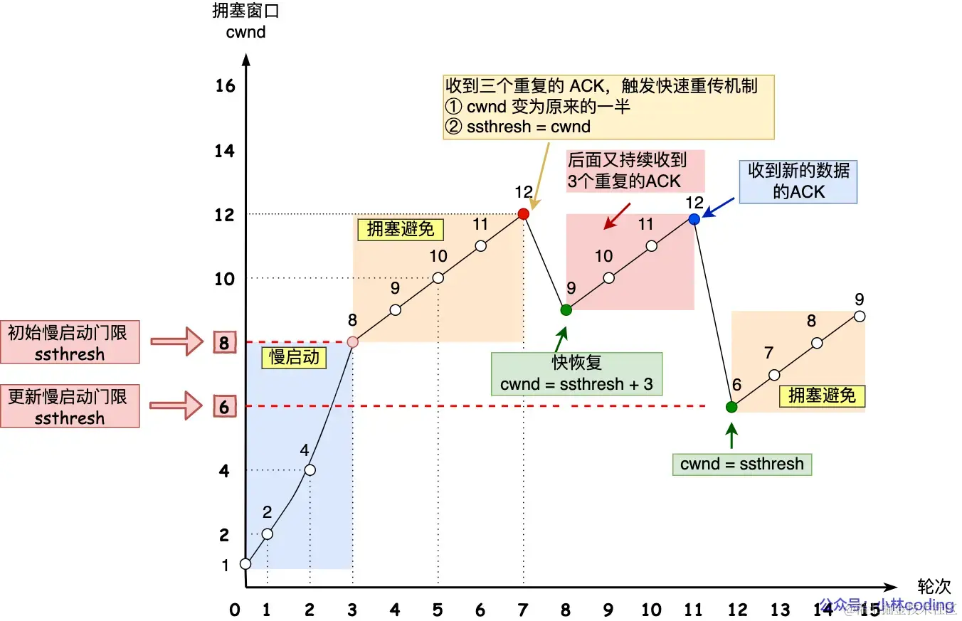 收到新的数据 ACK 后,cwnd 设置成第一步中的 ssthresh 的值,即原来窗口大小的一半。因为此时收到了新的数据 ACK,说明快速恢复已经结束,再次进入拥塞避免状态。