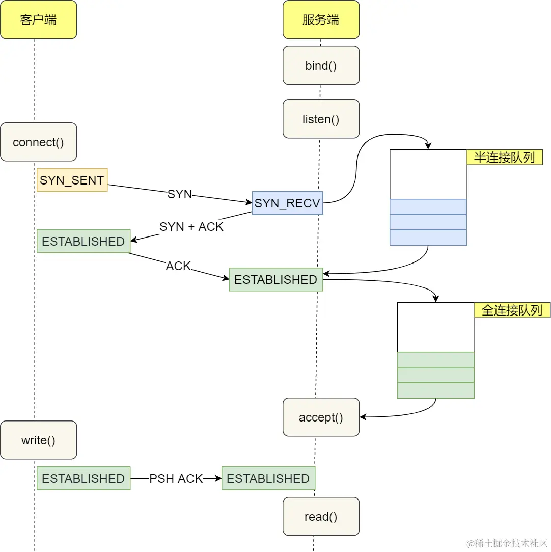 服务器第一次收到客户端的 SYN 之后,就会处于 SYN_RCVD 状态,此时双方还没有完全建立其连接, 服务器会把此种状态下请求放在半连接队列(SYN 队列) 。
