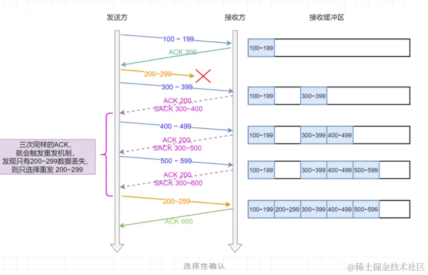 如下图,发送方收到了三次同样的 ACK 确认报文,于是就会触发快速重传机制,通过 SACK 信息发现只有 200~299 这段数据丢失,则重发时,就只选择了这个 TCP 段进行重复。
