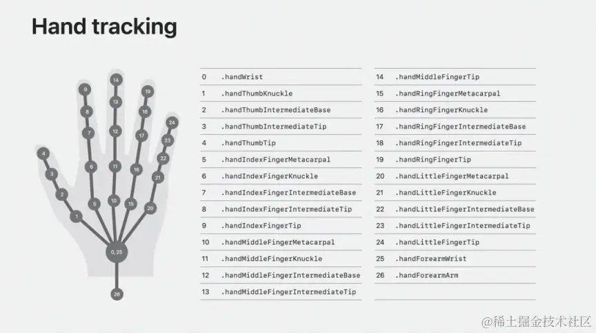 手势识别离不开 ARKit 的助力。ARKit 是 Apple 开发的一套增强现实开发工具包,最初在 iOS 在推出,现在也可用于 visionOS 中。其提供了一系列包括空间感知、运动追踪等强大的功能和工具,能够创建逼真的 AR 体验。在快手 vp 版中,充分利用了 Vision Pro 多摄像头和传感器识别用户的手部动作和手势,实现自然的空间交互。通过 ARKit,设备能够实时检测和跟踪用户的手部位置和姿态,可以识别手部的各种关键点,如手指关节和手掌位置,从而精确地捕捉手部的运动。下图为 Apple 提供的手部关键点名称。