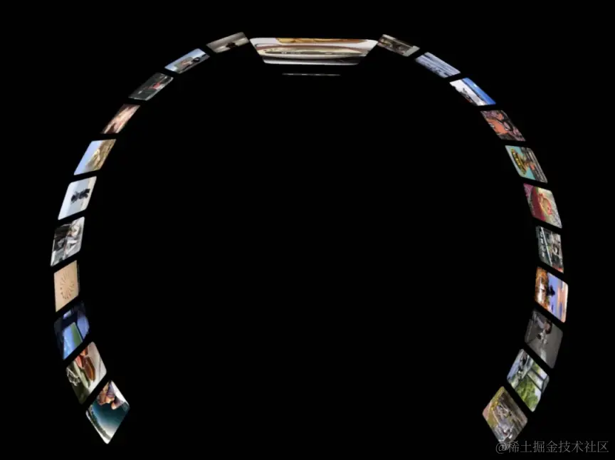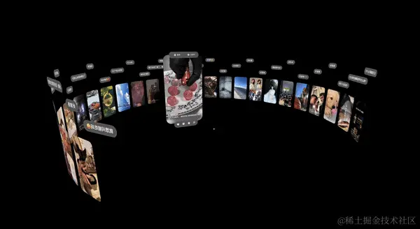 通过视图变换方程,最终可得到一个可视范围最大可至 360°的可拖动环绕体(下图例为 270°),实现环绕式的绝佳浏览体验。沿着环绕体进行漂浮的空间弹幕也基于上述结果实现,利用构成环绕体的基本方程式,即可获取空间弹幕在渲染时每帧所需要修正的三维变换。空间弹幕突破了传统平面弹幕的限制,呈现出一种全新的、立体的弹幕效果,使得用户在浏览内容时能够享受到更加丰富和动态的视觉体验。