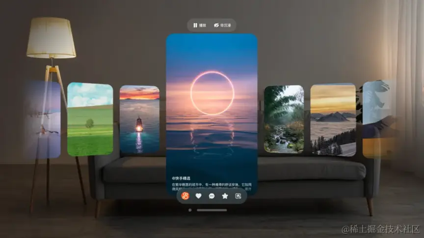 在快手 vp 版 app 中,我们并非简单地将传统的点赞、评论、收藏转发等功能“照搬”到 Vision Pro 中,而是基于 visionOS 操作系统进行了深度的定制化开发。快手精心打造了一系列创新功能,旨在满足用户日益多样化的需求,为观看短视频的打造全新的交互方式。快手 vp 版 app 致力于打破触媒的次元壁,让用户享受更加自由、便捷和个性化的沉浸式交互体验。