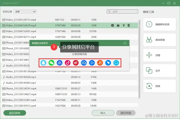 步骤4:在录制历史页面,我们可以找到录制过的直播视频,右键选择分享按钮,就可以快速分享到其它社交媒体平台。
