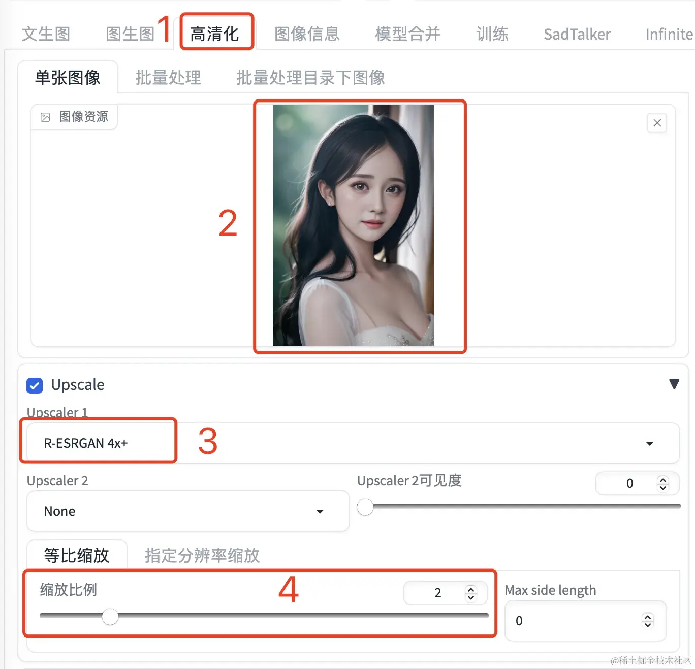 我们先来看一个简单的换脸例子,在WebUI中进入“高清化”(有的翻译为“扩展功能”)页面: