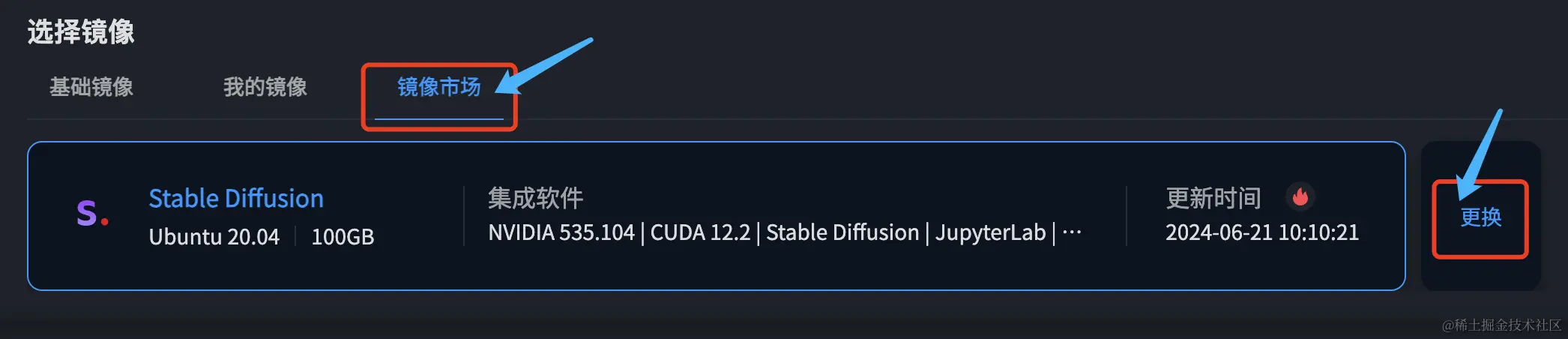 注册成功后,创建实例时,选择镜像请依次点击:“镜像市场”->“更换”->“AI绘画”->“萤火遛AI-Stable Diffusion”。