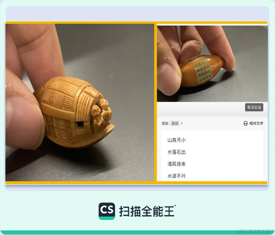 历史不止在书上,更体现在生活的方方面面。现场体验中可以看到,除了古籍的数字化修复外,扫描全能王的智能高清滤镜功能已经被广泛应用于各种文档的数字化处理中。在展区,参观者能亲眼见证在滤镜提升图像清晰度的神奇效果。使用滤镜提升图像清晰度后,可从4厘米长的核桃上提取一组微雕文字,每个字仅有1毫米长。山高月小,水落石出;清风徐来、水波不兴。“核舟记”蕴含的精巧、细致之美,正在新的时代被AI以另一种方式续写。
