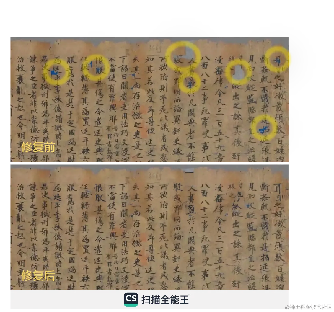 做好古籍保护工作,对赓续中华文脉、增强国家文化软实力、建设社会主义文化强国具有重要意义。2023年《政府工作报告》提出要“弘扬中华优秀传统文化,加强文物和文化遗产保护传承”,古籍保护正受到越来越多的关注。扫描全能王与华南理工大学团队共同研发古籍修复模型,通过AIGC技术,为敦煌遗书的数字化修复提供了新的解决方案,旨在解决中文古籍文档中存在的文字残缺、字迹污损难辨认等问题。