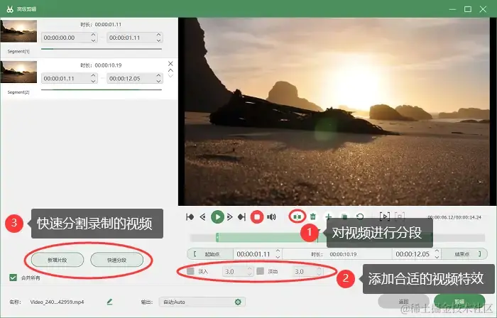 步骤3:录制完成后,我们可以使用软件自带的高级剪辑功能进行裁剪、分割视频、调整音量等后期处理,以达到合适的视频效果。