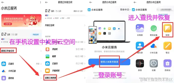 步骤2:而云备份还需要登录云服务账号,然后再查找短信内容进行恢复。