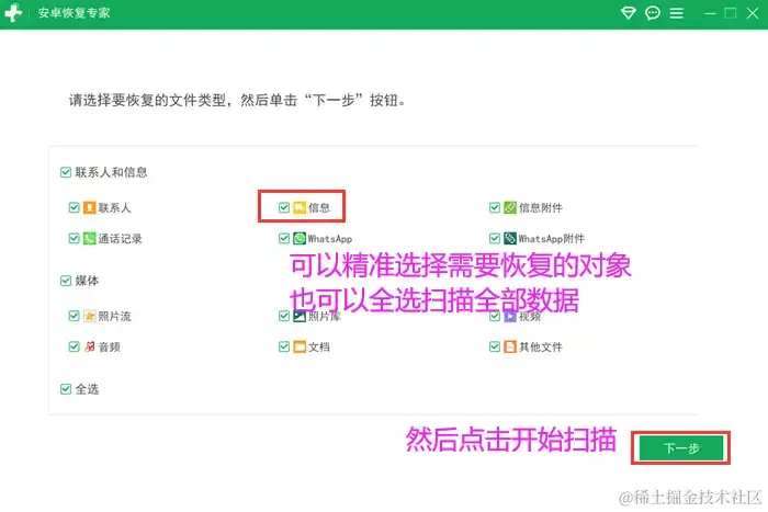步骤2:在选择恢复对象的页面,我们可以全选,将所有数据扫描出来。也可以单独选择某一项,然后精确扫描。