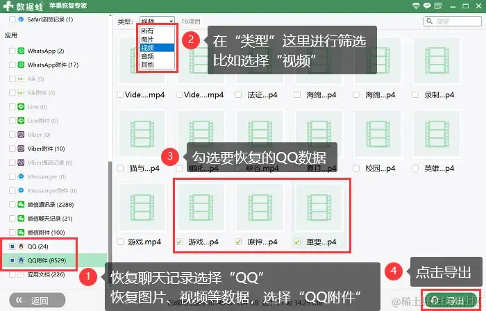 qq空间视频已删除怎么恢复?在【QQ】或者【QQ附件】中,通过筛选器找到你需要恢复的QQ数据(这里选择【视频】)。最后,选择需要恢复的文件,点击【导出】按钮,将它们保存到你的电脑中。