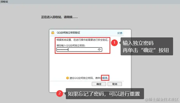 进入 【回收站】 之前,需要我们输入 【独立密码】 ,如果你不记得,可以进行 【重置】 。