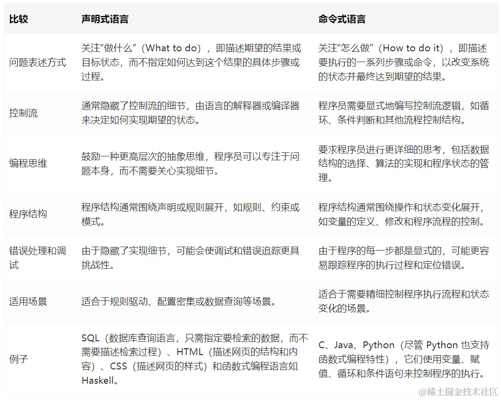 为了寻找适合用户的编写静态分析规则的语言,我们来看下我们常见的两种编程范式:声明式语言(Declarative Language)和命令式语言(Imperative Language)。这两者语言在如何描述程序行为和解决问题的方法上存在根本差异, 但同时各有优势和适用场景, 许多现代编程语言支持这两种范式, 允许程序员根据具体问题选择最合适的方法。