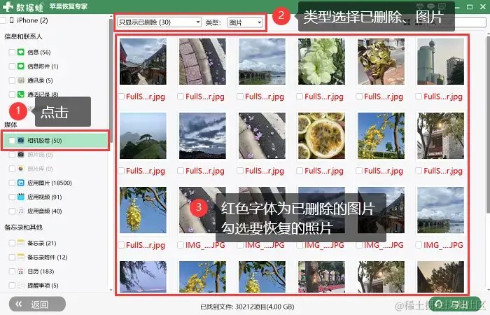 第3步:在 【相机胶卷】 右侧界面,通过筛选器快速找到已经删除的照片 (红色字体为已经删除的图片) ,并勾选要恢复照片前面的小方框。