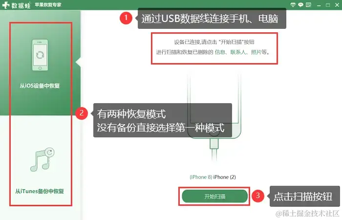 第2步:使用数据线将iPhone连接到电脑上,并确保软件能够识别并连接到你的设备。根据软件提示,选择适合你的恢复模式,并点击 【扫描】 按钮。