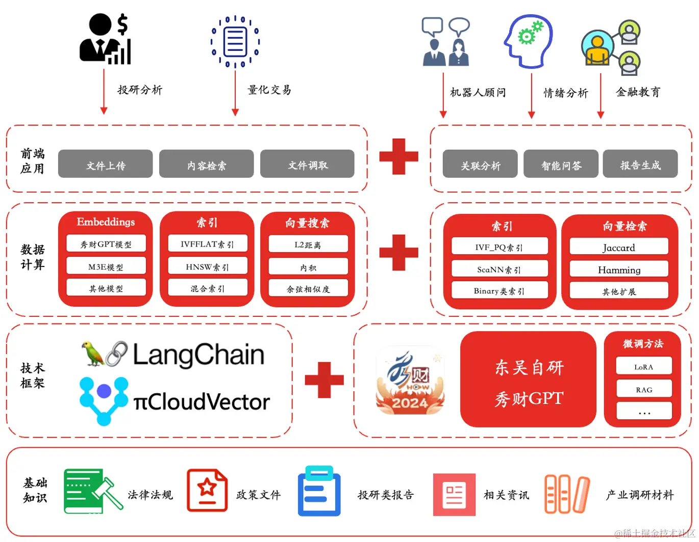 为了提高检索工作的效率和准确性,该金融客户采用 PieDataCS 打造了基于向量计算引擎的 AIGC 应用解决方案,通过自研大模型东吴秀财 GPT,结合 LangChain 开发框架以及 PieCloudVector 构建了 AIGC 应用平台。将把传统文本类数据做成 Embedding,导入 PieCloudVector 中,从而实现根据需求,对内容进行精准搜索或全文检索。满足了该客户基于 GPT 构建投研分析、量化交易、智能顾问、情绪分析等多个场景的 AI 应用的需求。