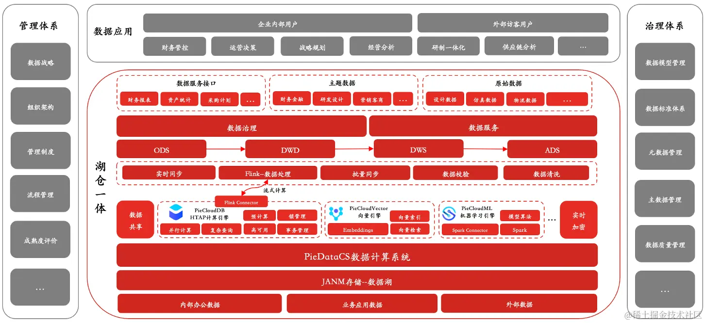 在数字化转型的需求下,某大型央企通过采用 PieDataCS 作为新一代的数字底座,完成原有数据平台的替换,对接企业内部的 OA、CRM、ERP 等应用系统,将企业内部办公数据、业务应用数据以及外部数据统一整合到 PieDataCS 的简墨数据湖中,再根据不同的数据格式去采用 PieDataCS 数据计算系统的不同的计算引擎进行处理。