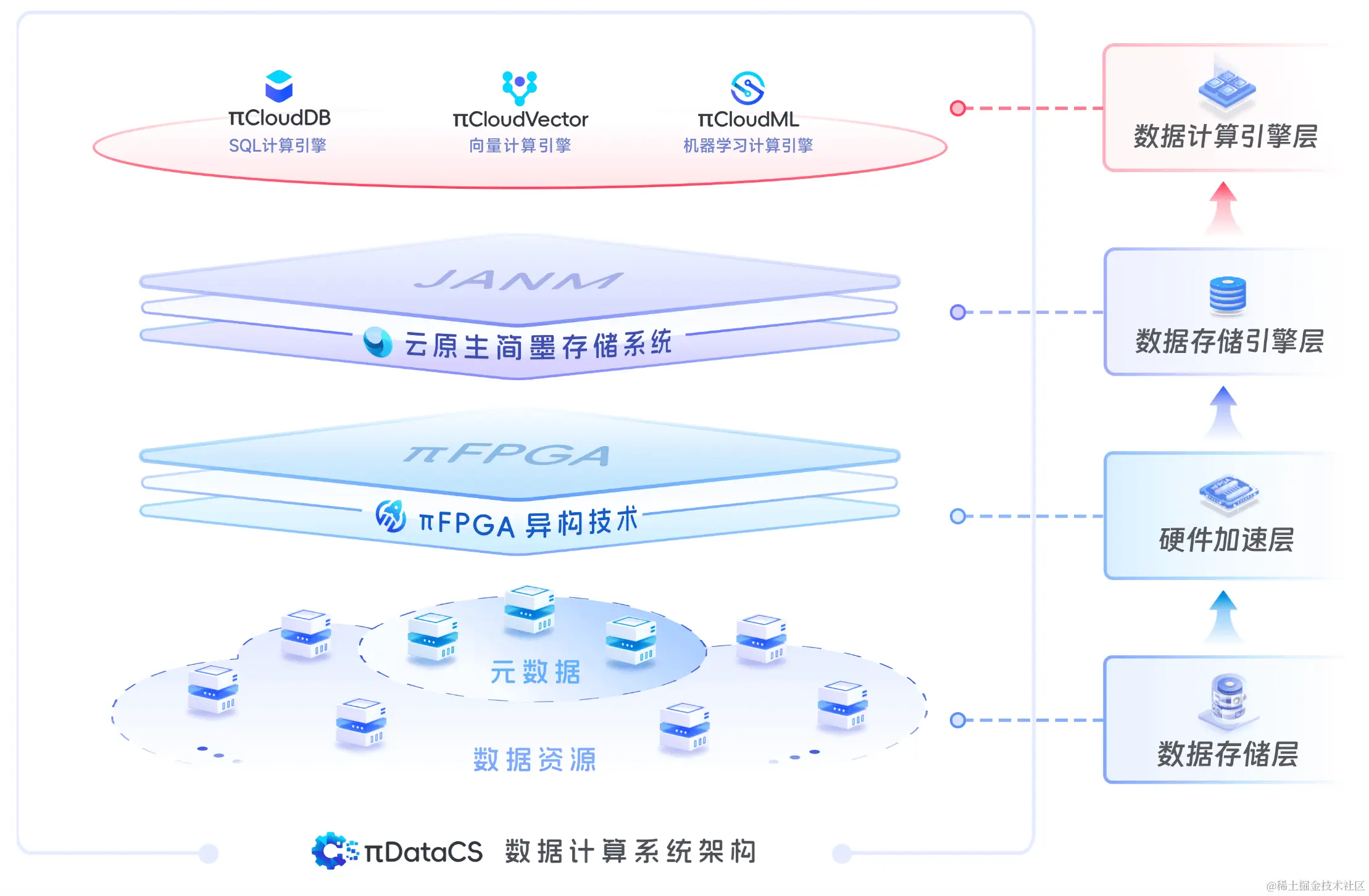 PieDataCS 自下而上可分为数据存储层、硬件加速层、数据存储引擎层以及数据计算引擎层: